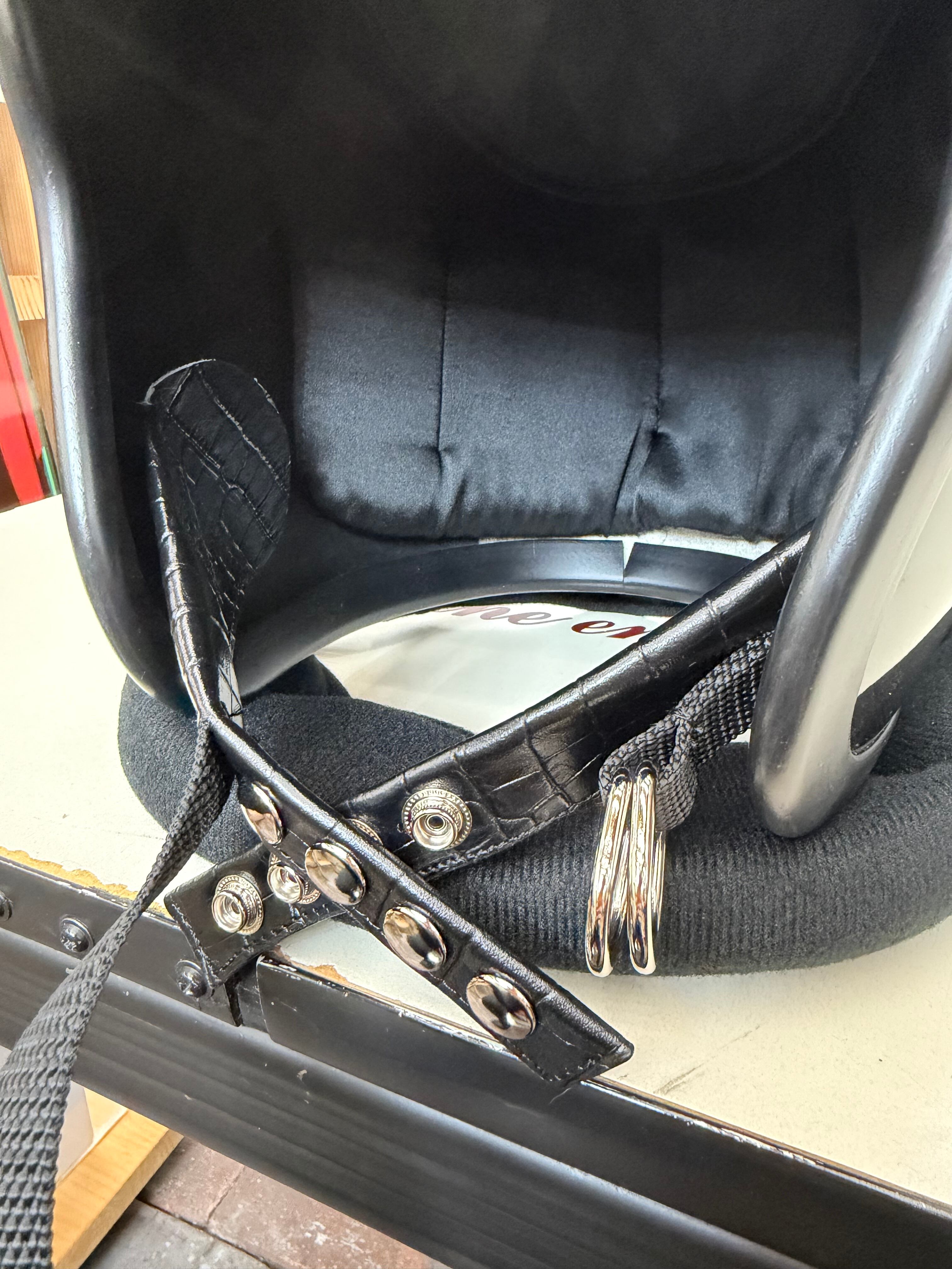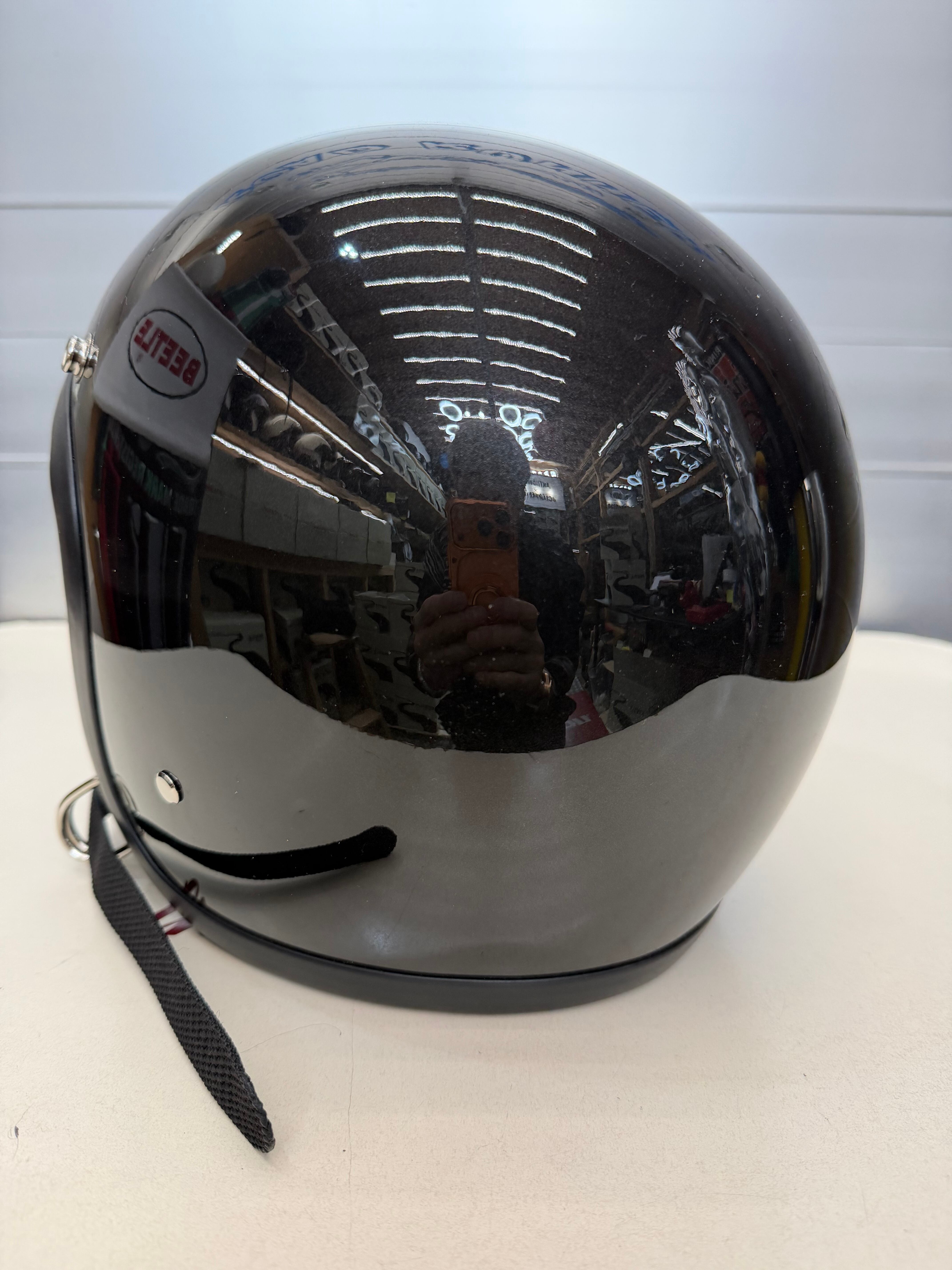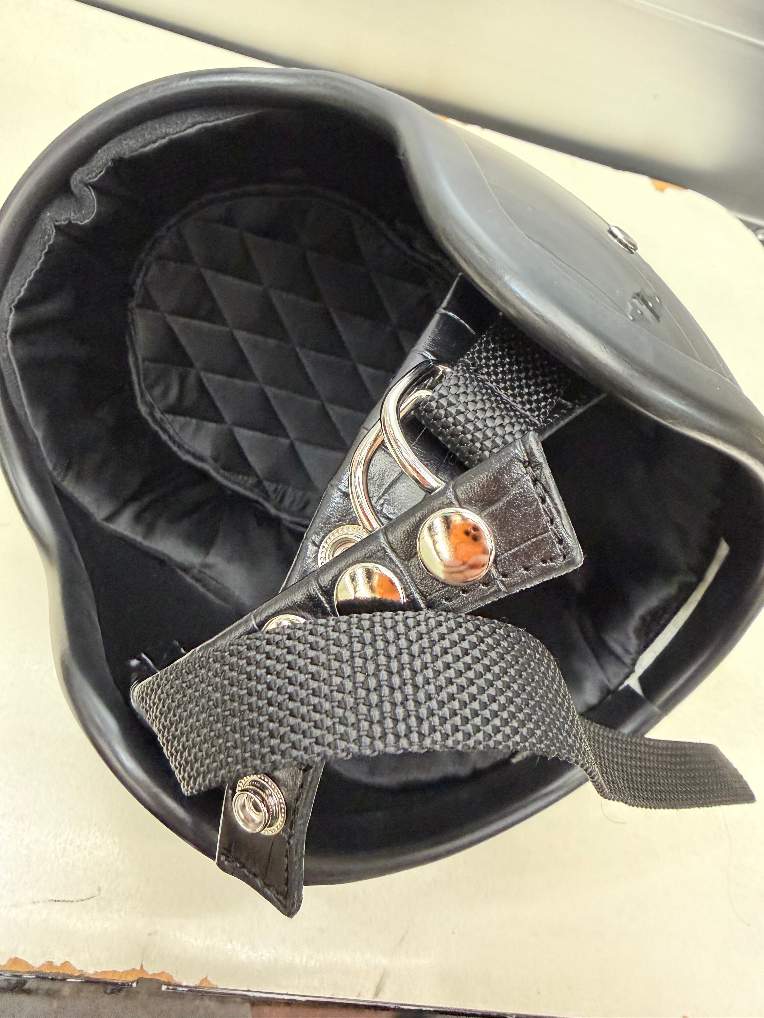 オールドヘルメットはダブルストラップの仕様が多く使われていて、金具、レザー部分がよりカッコ良さを引き立てます。